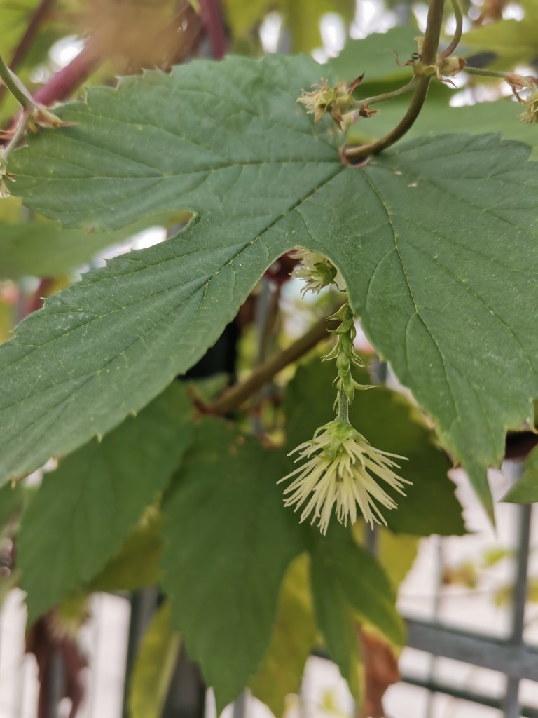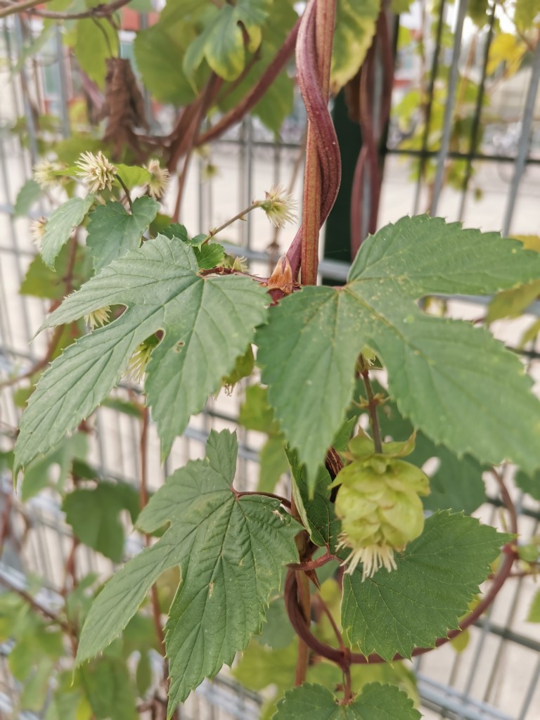 In onze tuin is drie jaar geleden spontaan een hopplant beginnen te groeien. Ze groeide tegen een wand die wel wat extra groen kon gebruiken, dus liet ik ze maar staan en plaatste ik een soort klimrekje tegen die wand. Vorig jaar hingen er enorm veel hopbellen aan, dit jaar bijna geen. Ach, ze doet maar, ik vind ze mooi met of zonder hopbellen.