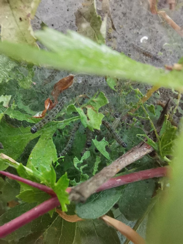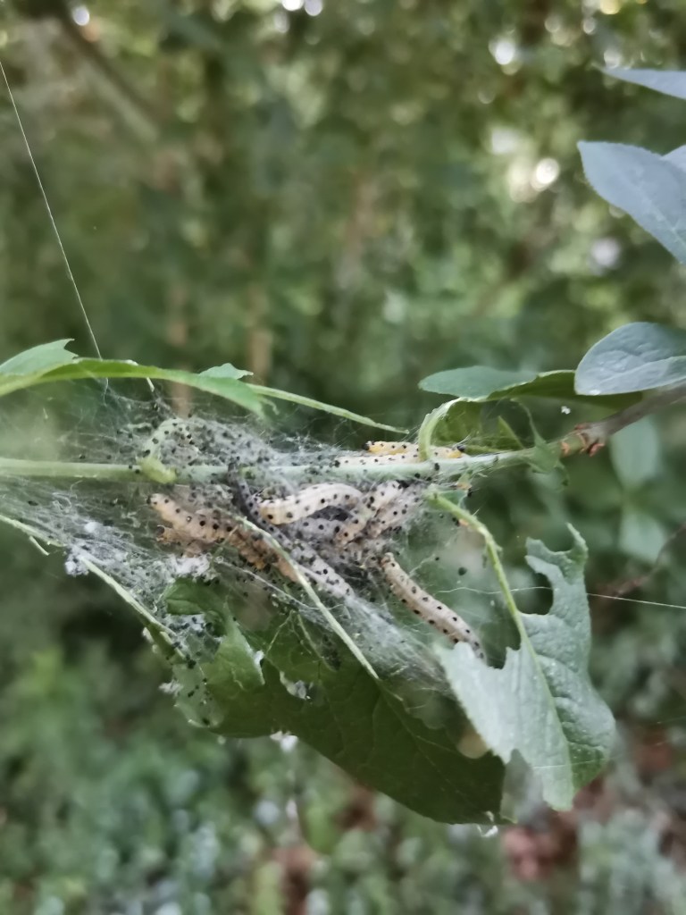 Betekenis naam: Deze motten, waarvan ik de rupsen op de foto heb, kenmerkt zich net als andere soorten stippelmotten, door de duidelijke stippen op zowel de larve als de imago. Yponomeutidae is afgeleid van het geslacht Yponomeuta, wat een gelatiniseerd woord is, afkomstig van verschillende woorden uit het Oud-Grieks. Het betekent ‘(onder)mijnend’, of ook wel ‘heimelijk etend’. Dit past wel, want veel Yponomeuta-soorten hebben minerende rupsen.
