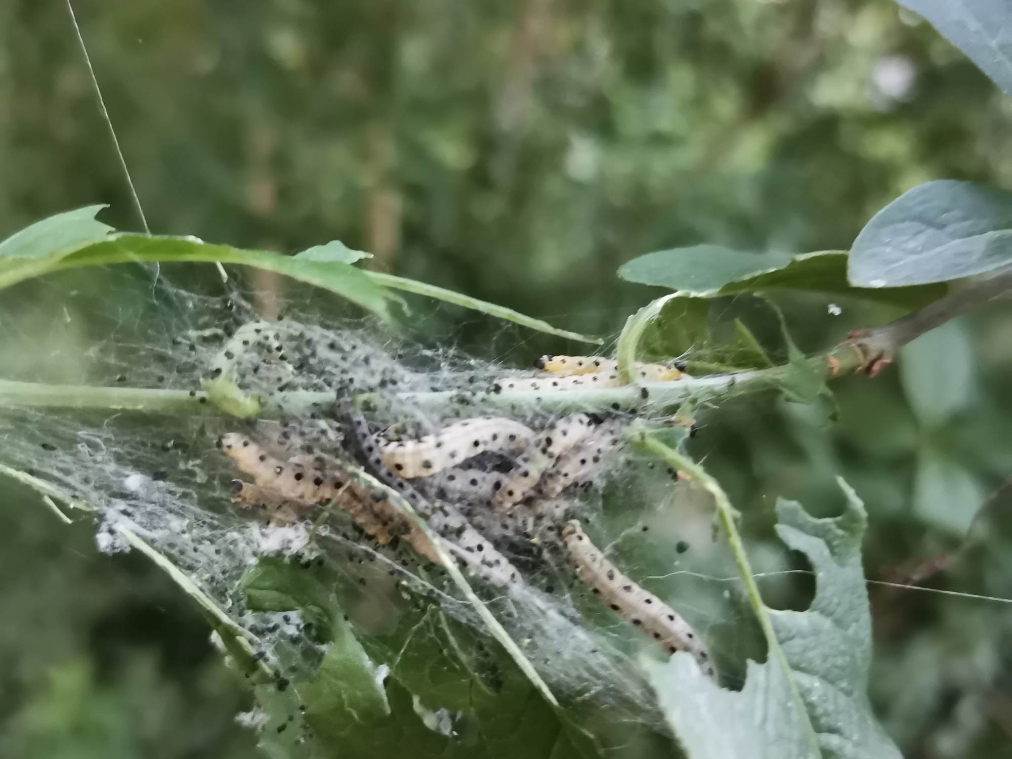 Betekenis naam: Deze motten, waarvan ik de rupsen op de foto heb, kenmerkt zich net als andere soorten stippelmotten, door de duidelijke stippen op zowel de larve als de imago. Yponomeutidae is afgeleid van het geslacht Yponomeuta, wat een gelatiniseerd woord is, afkomstig van verschillende woorden uit het Oud-Grieks. Het betekent ‘(onder)mijnend’, of ook wel ‘heimelijk etend’. Dit past wel, want veel Yponomeuta-soorten hebben minerende rupsen.